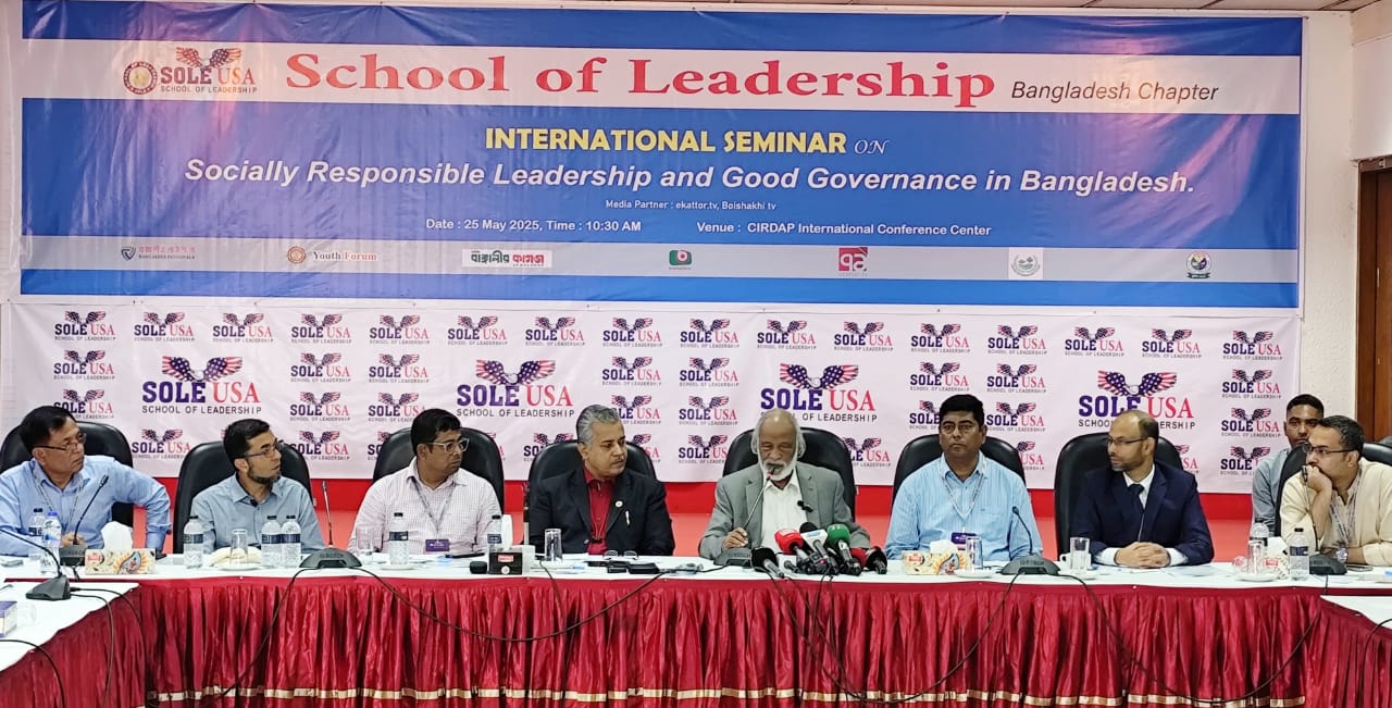 নিজস্ব প্রতিবেদক, জিএনএ, ঢাকা:  "বাংলাদেশে সামাজিক দায়িত্বশীল নেতৃত্ব এবং সুশাসন” শীর্ষক একটি আন্তর্জাতিক সেমিনার অনুষ্ঠিত হয়েছে। রোববার (২৫ মে) সকালে রাজধানীর সিরডাপ মিলনায়তনে যুক্তরাষ্ট্র ভিত্তিক সংগঠন 'স্কুল অফ লিডারশিপ' (SOLE USA) বাংলাদেশ শাখার উদ্যোগে এ সেমিনারের আয়োজন করা হয়। দেশের বিভিন্ন দলের শীর্ষ রাজনৈতিক নেতৃবৃন্দ, শিক্ষক, গবেষক, আইনজীবি, চিকিৎসক, উন্নয়ন কর্মকর্তা ও সাংবাদিক নেতৃবৃন্দ সেমিনারে অংশগ্রহণ করেন।