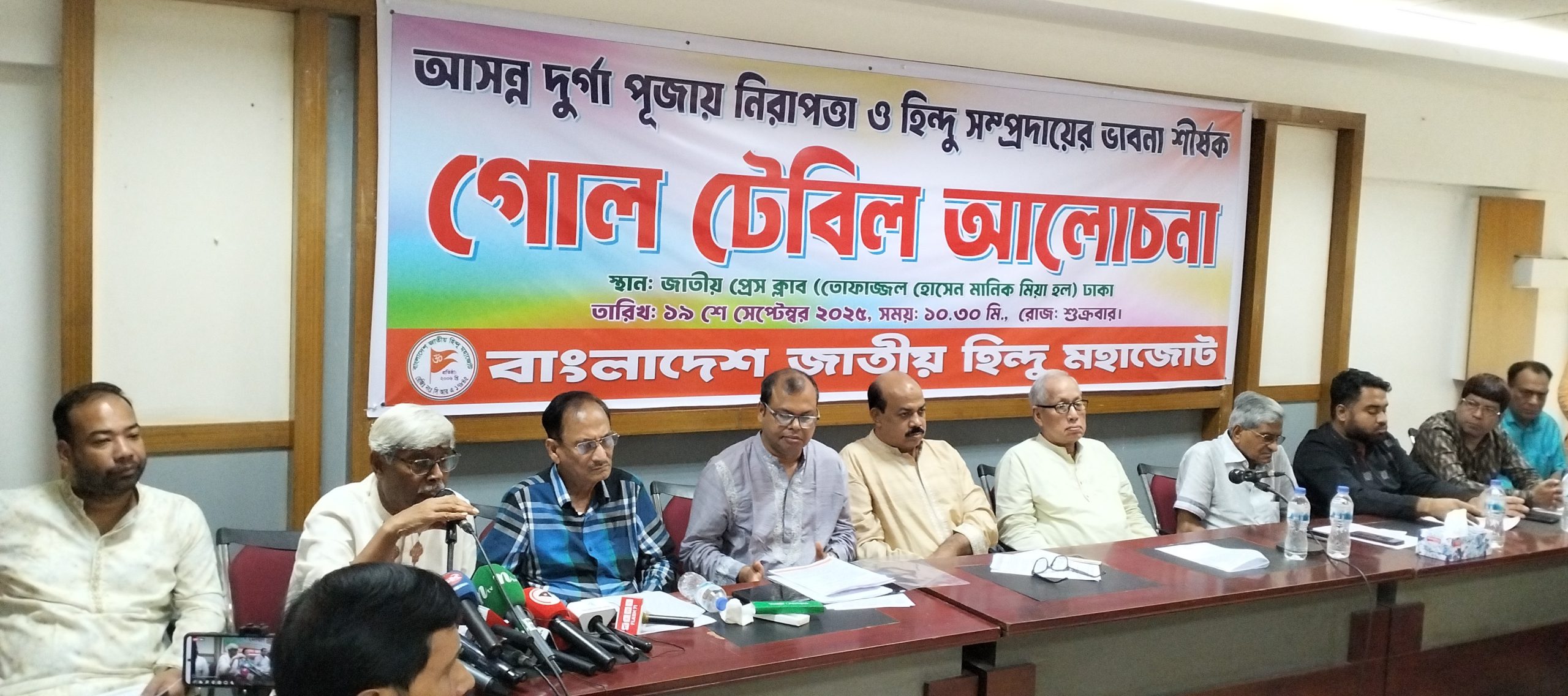 নুরুউল্লাহ হাওলাদার সবুজ, ঢাকা:  বাংলাদেশ জাতীয় হিন্দু মহাজোট এর আয়োজনে আসন্ন দূর্গা পুজায় নিরাপত্তা ও হিন্দু সম্প্রদায়ের ভাবনা শীর্ষক গোল টেবিল আলোচনা অনুষ্ঠিত হয়। আজ ১৯ শে সেপ্টেম্বর ২০২৫ ইং সকালে জাতীয় প্রেস ক্লাব, ঢাকায় (তোফাজ্জল হোসেন মানিক মিয়া) হলে লিখিত বক্তব্য পাঠ করেন পলাশ কান্তি দে, নির্বাহী মহাসচিব ও মুখপাত্র বাংলাদেশ জাতীয় হিন্দু মহাজোট। আজকের আলোচনা সভার সভাপতিত্ব করছেন ড. প্রভাস চন্দ্র রায়, সভাপতি-বাংলাদেশ জাতীয় হিন্দু মহাজোট।