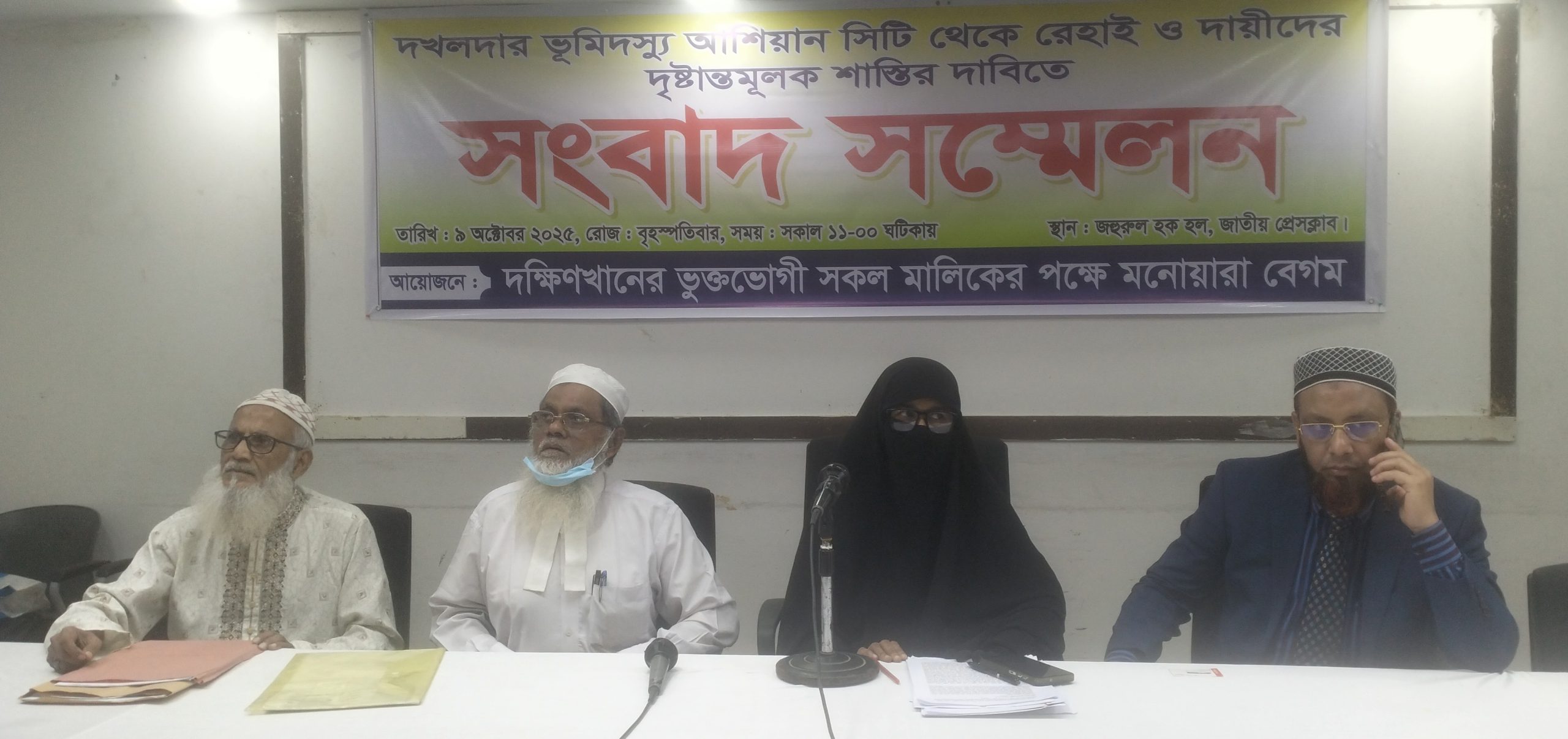 বিগত ৩০ বছর ধরে আশিয়ান সিটির মালিক নজরুল ইসলাম ভূঁইয়ার নির্যাতনের অনেক ভুক্তভোগির মধ্যে একজন মনোয়ারা বেগম। গত ৯ই অক্টোবর ২০২৫ইং সকালে ঢাকা জাতীয় প্রেসক্লাবের দ্বিতীয় তলার জহুর হোসেন চৌধুরী হলে সংবাদ সম্মেলনে মনোয়ারা বেগম বলেন, গত সরকারের আমলে সে আমার বাড়ি-ঘর দখল করতে পারেনি। কিন্তু বর্তমান সময়ে সরকারের অনুপস্থিতিতে আমার বাড়ি-ঘর জোর দখল করে নিয়েছে। আমার-পিতার পৈত্রিক সম্পত্তি আমার পিতা আমার নামে হেবা করে দিয়েছে। ৩৩ শতাংশ জমি ৩৭৫-নং দলিল দ্বারা খরিদ করে নামজারি ও খাজনা-খারিজ সম্পন্ন করেছি।