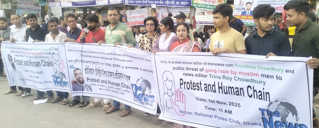 নুরুউল্লাহ হাওলাদার সবুজ, ঢাকা: বাংলাদেশ সরকারের নিয়ম নীতি মেনে সুনামের সাথে ১৪ বছর ধরে চলমান দ্যা নিউজ ডটকম (thenewse.com) এর সম্পাদক ও প্রকাশক প্রমিথিয়াস চৌধুরীকে ইসকন এর ট্যাগ লাগিয়ে খোলা বাজারে টর্চার, জিম্মি করে স্ট্যাম্পে স্বাক্ষর এবং ব্যাংকের চেকের পাতা নেওয়া, বার্তা সম্পাদক তৃণা রায় চৌধুরীকে মুসলিম পুরুষদের দিয়ে গ্যাং রেপের প্রকাশ্য হুমকির প্রতিবাদ সমাবেশ ও মানব বন্ধন।