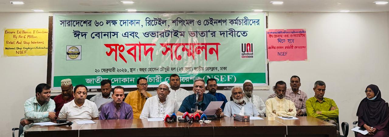 নুরুউল্লাহ হাওলাদার সবুজ, ঢাকা: দেশের মাননীয় রাষ্ট্রপতি, মাননীয় প্রধানমন্ত্রী থেকে শুরু করে সকল শ্রমজীবী মানুষই বছরে দুইটি ঈদে ঈদ বোনাস পেয়ে থাকেন। কিন্তু ব্যত্তয় ঘটে কেবল মাত্র দেশের ৬০ লক্ষ দোকান, রিটেইল, শপিংমল ও চেইনশপ কর্মচারীদের ক্ষেত্রে বলে উল্লেখ্য করেছেন জাতীয় দোকান কর্মচারী ফেডারেশন (NSEF)-এর নেতৃবৃন্দ। আজ ২০ ফেব্রুয়ারী ২০২৬ শুক্রবার সকাল ১১ টায় জাতীয় প্রেসক্লাব ঢাকায় অনুষ্ঠিত এক সংবাদ সম্মেলন থেকে সংগঠনটির নেতৃবৃন্দ এ কথা উল্লেখ করেন।