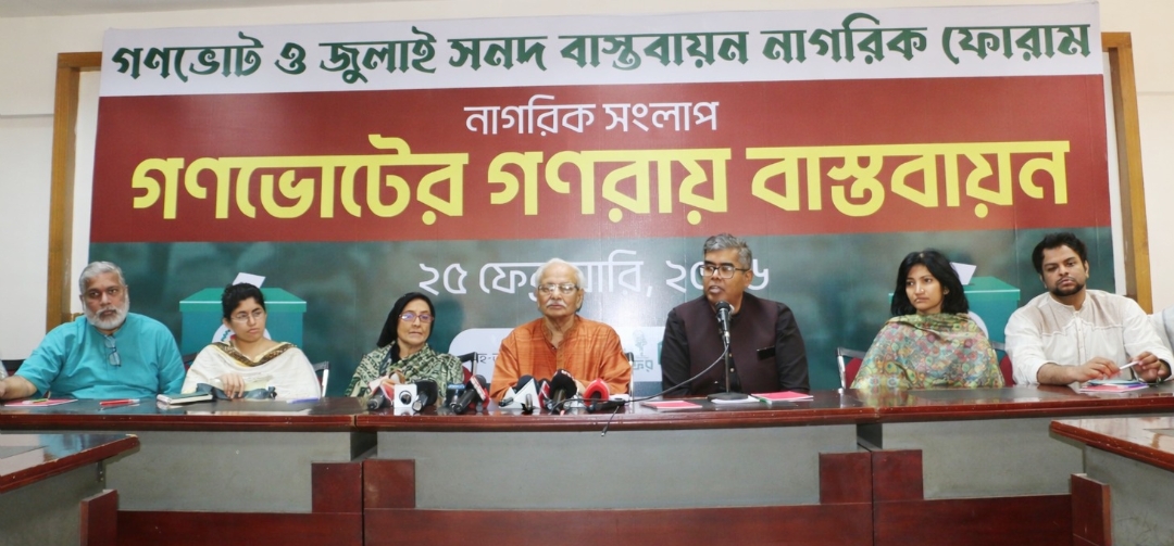 নুরুউল্লাহ হাওলাদার সবুজ, ঢাকা: গণভোট ও জুলাই সনদ বাস্তবায়ন নাগরিক ফোরাম ও ভয়েস ফর রিফর্ম-এর যৌথ উদ্যোগে আজ (২৫ ফেব্রুয়ারি) জাতীয় প্রেস ক্লাবের তোফাজ্জেল হোসেন মানিক মিয়া সম্মেলন কেন্দ্রে “গণভোটের গণরায় বাস্তবায়ন” শীর্ষক একটি নাগরিক সংলাপ অনুষ্ঠিত হয়I এই নাগরিক সংলাপে অংশ নেন সংস্কার নিয়ে কাজ করা বেশ কয়েকটি নাগরিক প্ল্যাটফর্মের প্রতিনিধি I এছাড়াও অংশ নেন জুলাই আন্দোলনে সরাসরি অংশ নেওয়া বেশ কয়েকজন জুলাই যোদ্ধা ও তাদের সংগঠনের প্রতিনিধিরাI ভয়েস ফর্ম রিফর্মের সমন্বয়ক ফাহিম মাশরুর নাগরিক সংলাপটি পরিচালনা করেনI