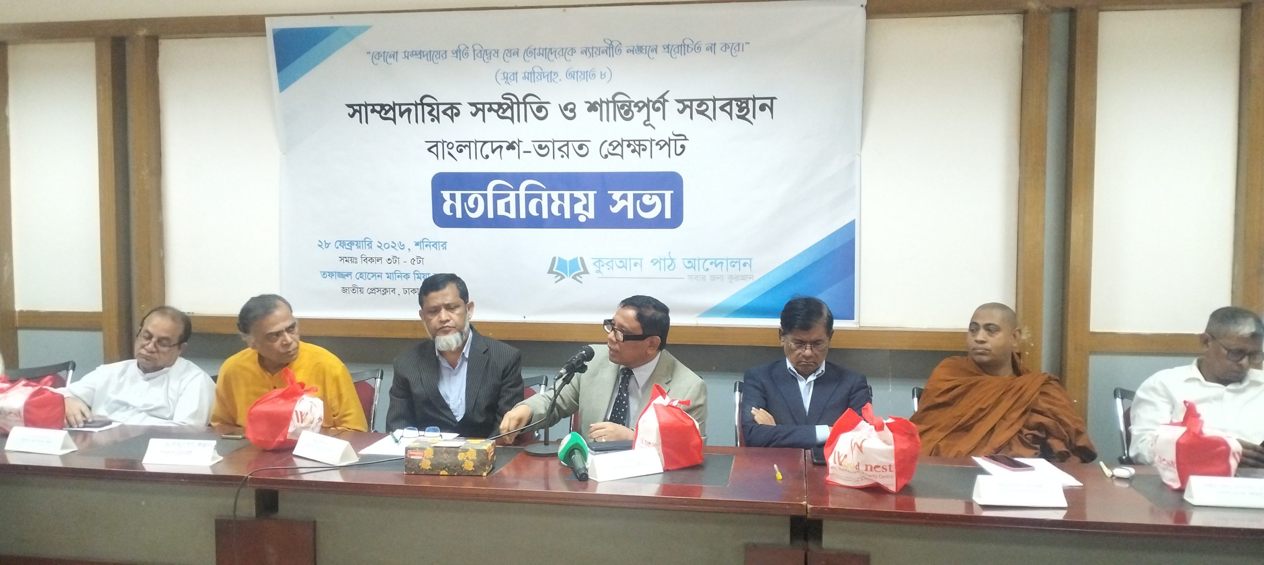 নুরুউল্লাহ হাওলাদার সবুজ, ঢাকা: কুরআন পাঠ আন্দোলন-এর আয়োজনে 'সাম্প্রদায়িক সম্প্রীতি ও শান্তিপূর্ণ সহাবস্থান: বাংলাদেশ-ভারত প্রেক্ষাপট' শীর্ষক একটি মতবিনিময় সভা অনুষ্ঠিত হয় আজ ২৮ ফ্রেব্রুয়ারি ২০২৬ শনিবার বিকেল ৩ টায় জাতীয় প্রেসক্লাবের তোফাজ্জল হোসেন মানিক মিয়া হলে।