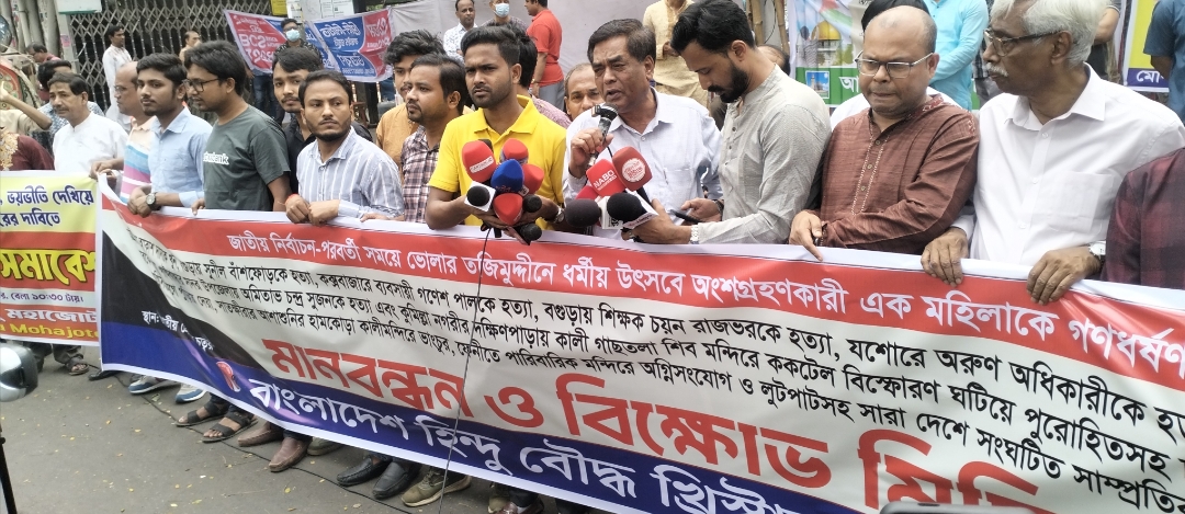 নুরুউল্লাহ হাওলাদার সবুজ, ঢাকা: ত্রয়োদশ জাতীয় সংসদ নির্বাচন ২০২৬ পূর্ববর্তী ও পরবর্তী ধর্মীয় সংখ্যালঘু সম্প্রদায়ের ওপর সহিংসতা, হত্যা, চাঁদাবাজি,বাড়িঘরে হামলা, অগ্নিসংযোগ, লুটপাট, ধর্ষন, ফেসবুকে ধর্ম অবমাননা, মন্দিরের জায়গা জোরপূর্বক দখল, মন্দিরে চুরি, ভাঙচুর, জবরদখলের প্রতিবাদে, ও অপরাধীদের গ্রেপ্তার করে কঠোর দৃষ্টান্তমূলক শাস্তির ব্যবস্থা করা এবং ভুক্তভোগী ক্ষতিগ্রস্ত পরিবারগুলোর সরকরী খরচে পুনর্বাসন ও আর্থিক সহায়তার দাবিতে মানববন্ধন ও বিক্ষোভ মিছিল অনুষ্ঠিত হয়। বাংলাদেশ জাতীয় হিন্দু মহাজোট, বাংলাদেশ জাতীয় হিন্দু বৌদ্ধ খ্রিস্টান ঐক্য পরিষদ সহ সকল হিন্দু সম্প্রদায়ের অঙ্গ সংগঠনগুলো রাজধানী ঢাকার জাতীয় প্রেসক্লাবের সামনে এই বিক্ষোভ মিছিল ও মানববন্ধন করে।